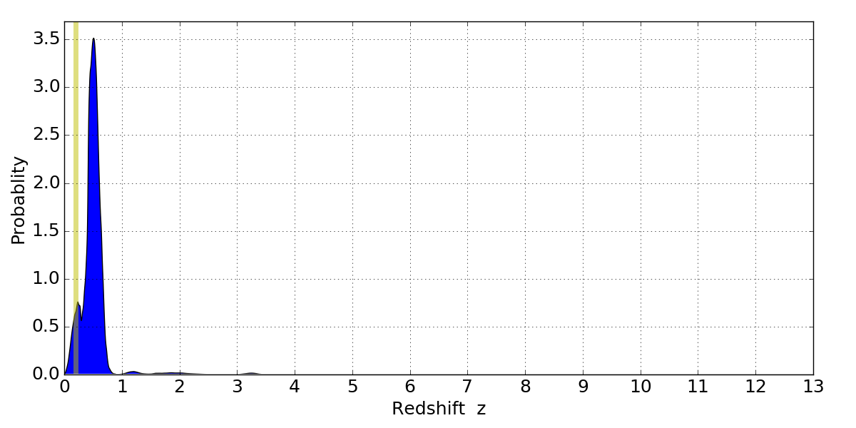 In P(z) plots: Yellow lines mark the cluster redshift z = 0.203,