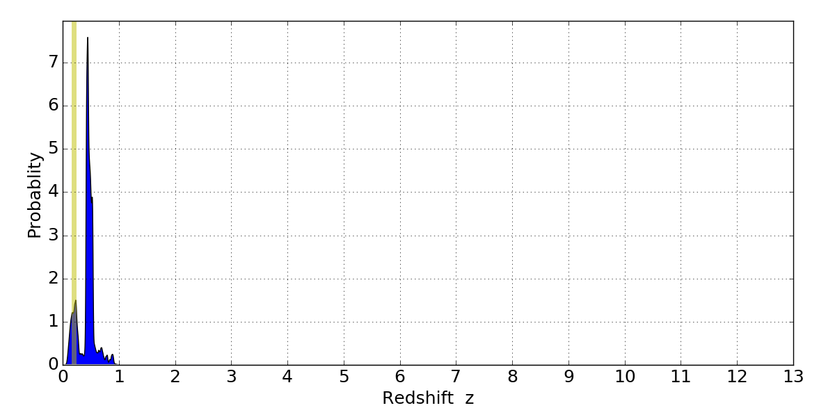 In P(z) plots: Yellow lines mark the cluster redshift z = 0.203,