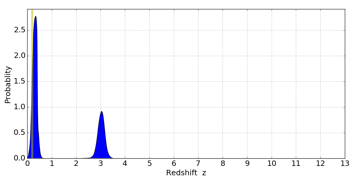 In P(z) plots: Yellow lines mark the cluster redshift z = 0.203,
