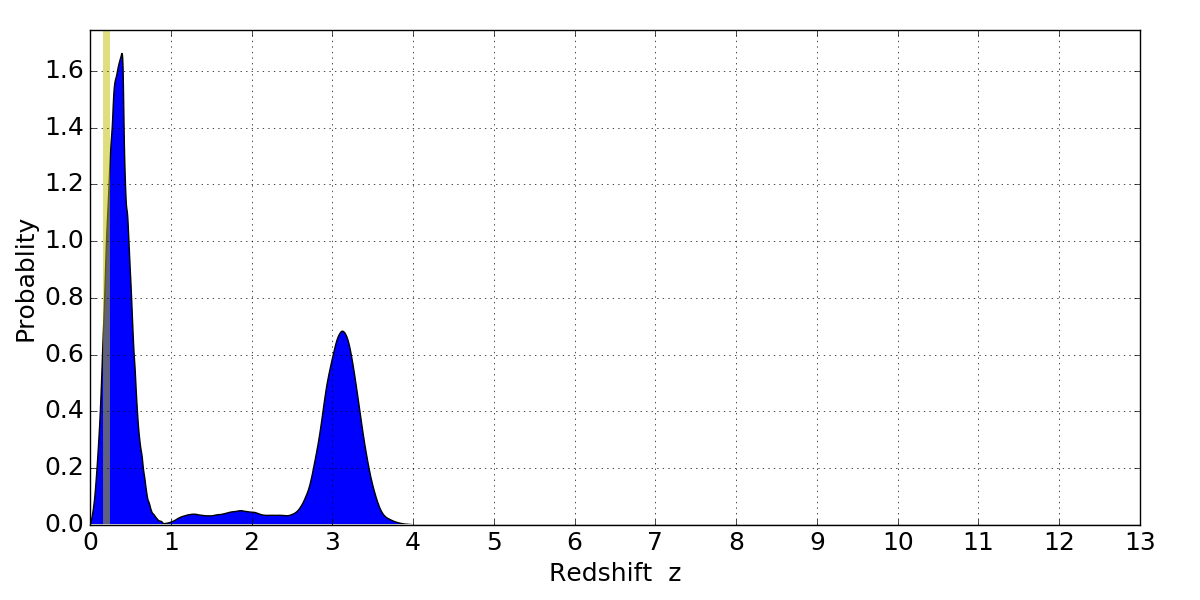 In P(z) plots: Yellow lines mark the cluster redshift z = 0.203,