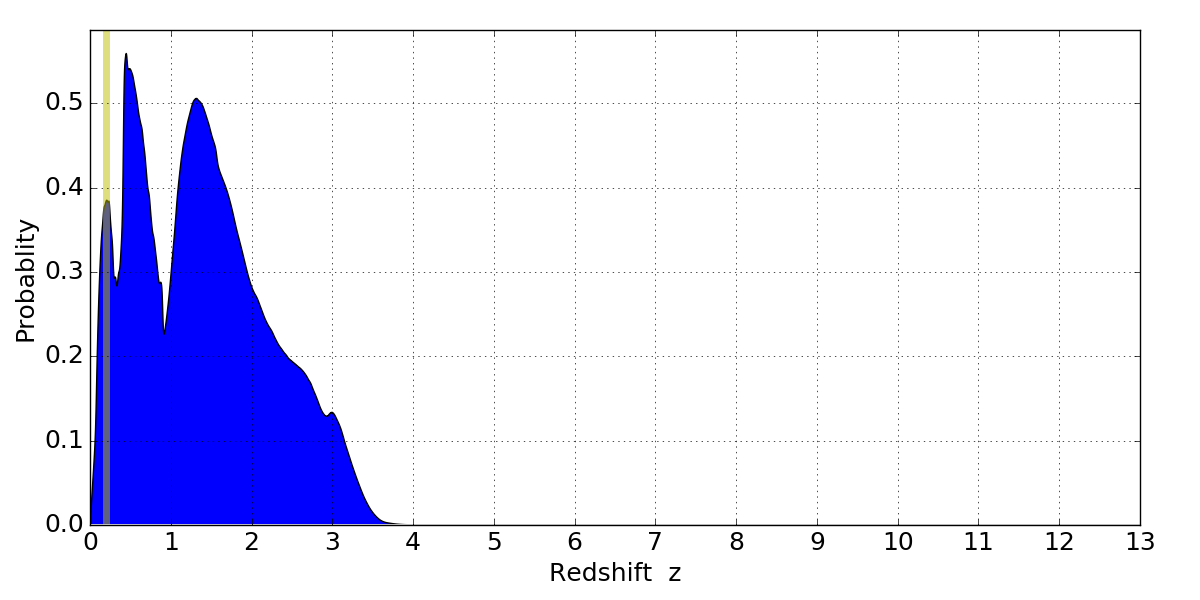 In P(z) plots: Yellow lines mark the cluster redshift z = 0.203,