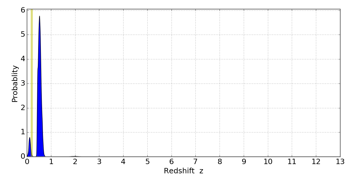 In P(z) plots: Yellow lines mark the cluster redshift z = 0.203,