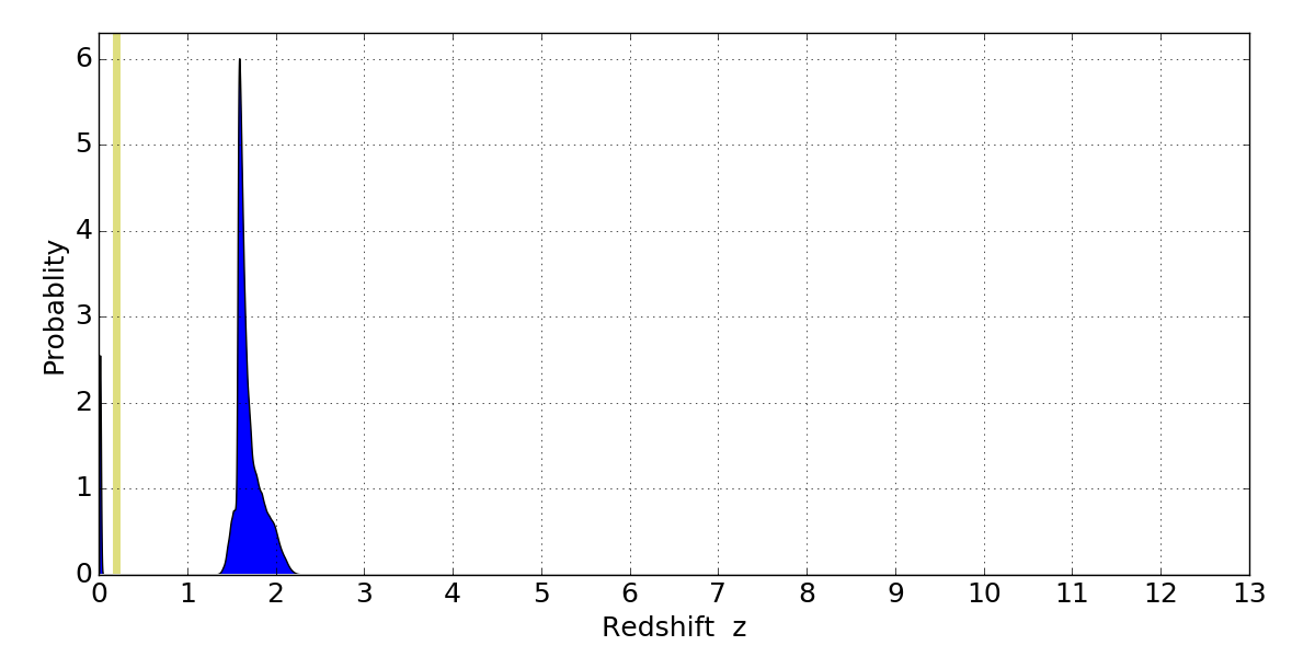 In P(z) plots: Yellow lines mark the cluster redshift z = 0.203,