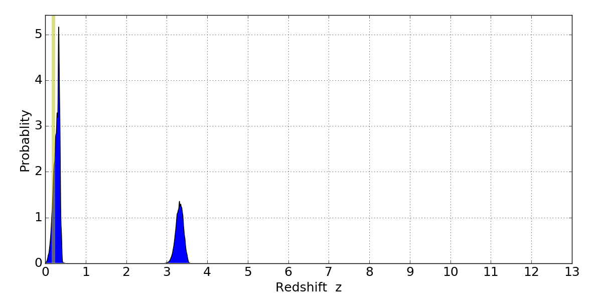 In P(z) plots: Yellow lines mark the cluster redshift z = 0.203,