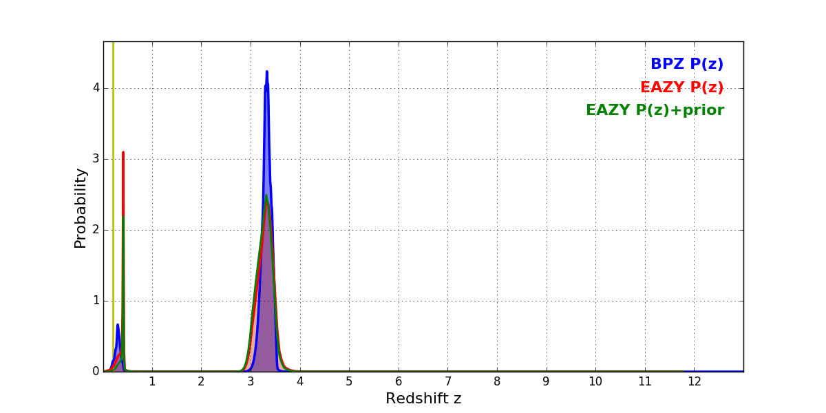 In P(z) plots: Yellow lines mark the cluster redshift z = 0.203,
