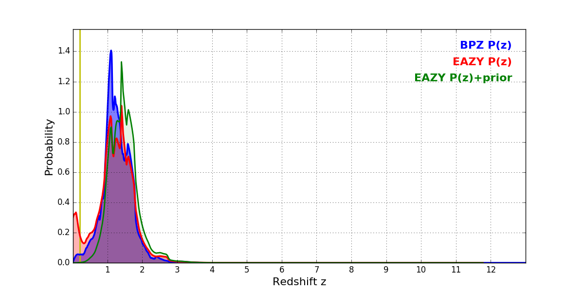 In P(z) plots: Yellow lines mark the cluster redshift z = 0.203,