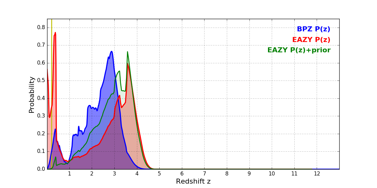 In P(z) plots: Yellow lines mark the cluster redshift z = 0.203,