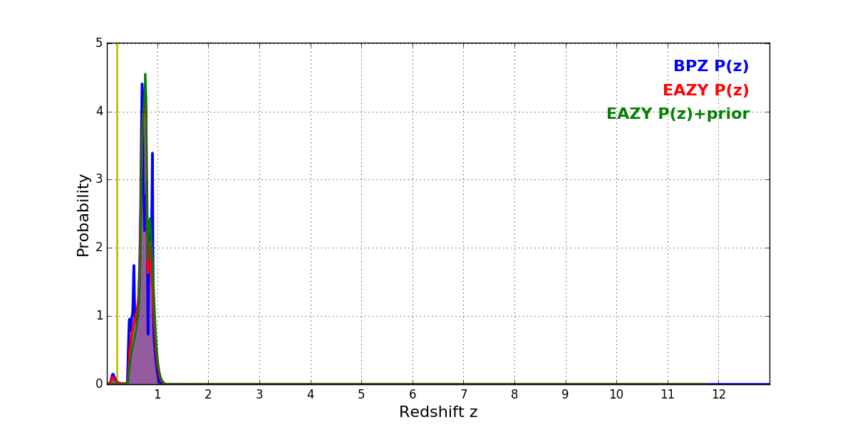 In P(z) plots: Yellow lines mark the cluster redshift z = 0.203,