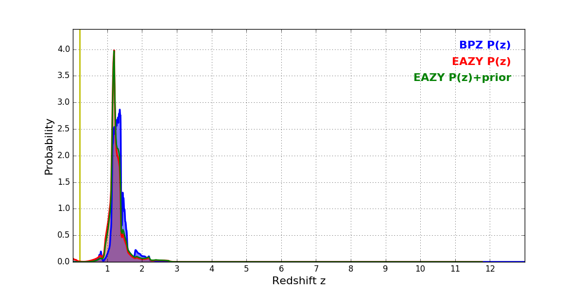 In P(z) plots: Yellow lines mark the cluster redshift z = 0.203,