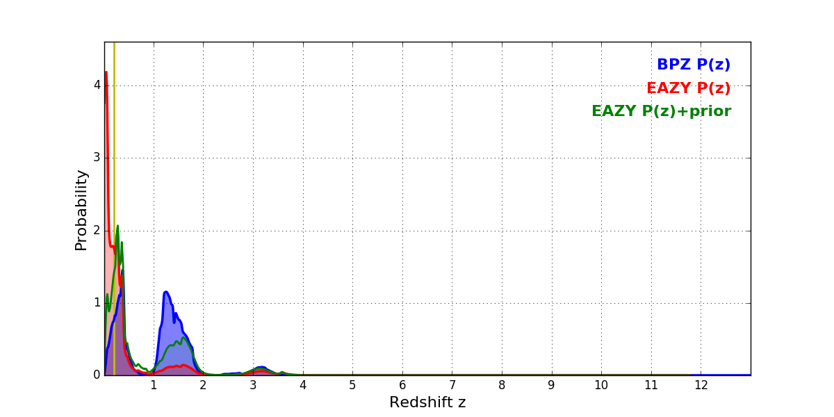 In P(z) plots: Yellow lines mark the cluster redshift z = 0.203,