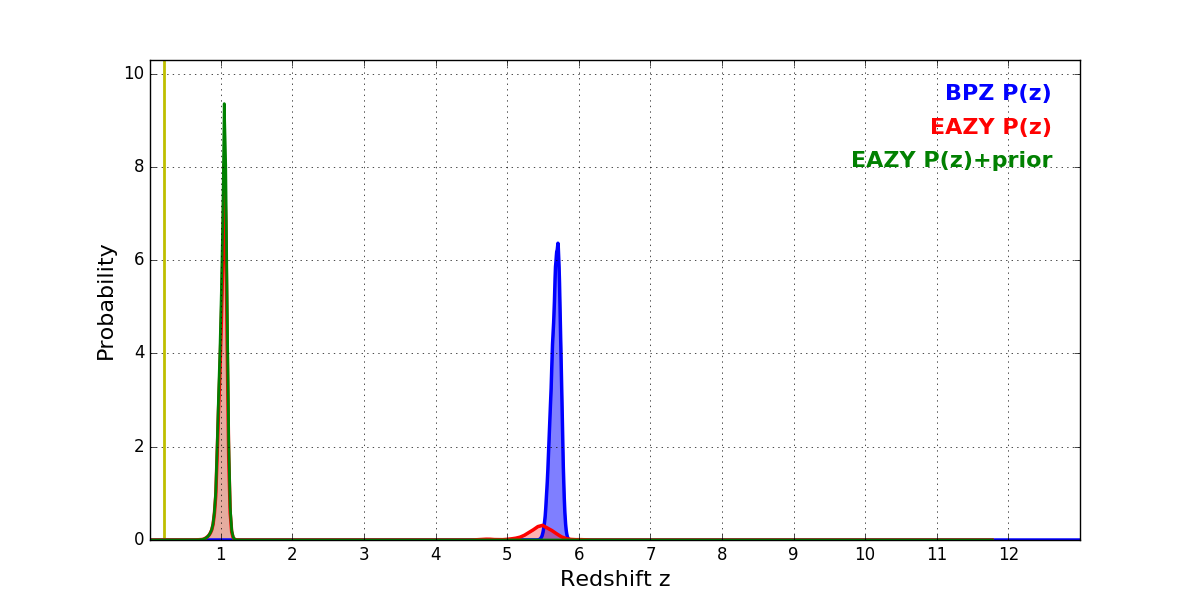 In P(z) plots: Yellow lines mark the cluster redshift z = 0.203,