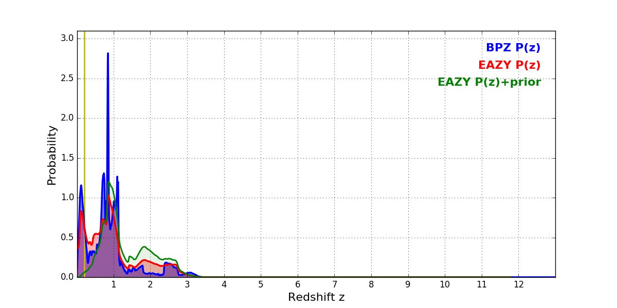 In P(z) plots: Yellow lines mark the cluster redshift z = 0.203,