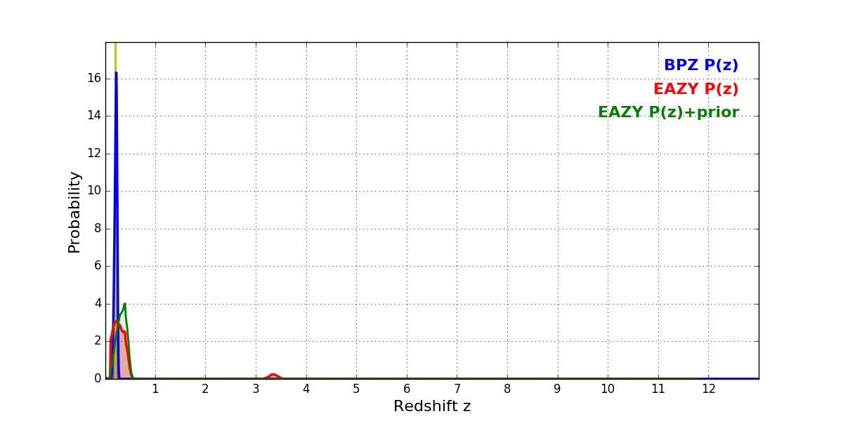 In P(z) plots: Yellow lines mark the cluster redshift z = 0.203,
