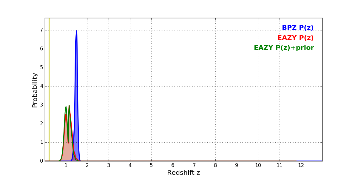 In P(z) plots: Yellow lines mark the cluster redshift z = 0.203,