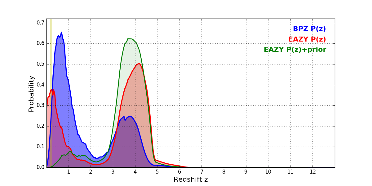 In P(z) plots: Yellow lines mark the cluster redshift z = 0.203,