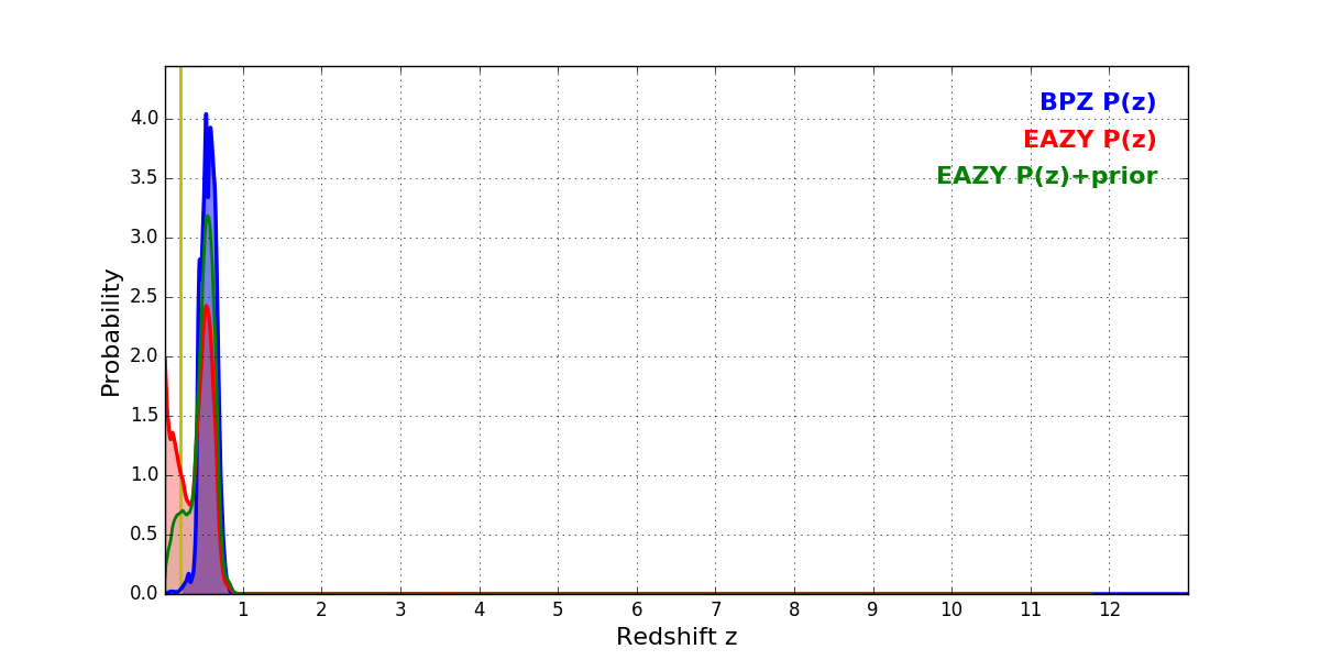In P(z) plots: Yellow lines mark the cluster redshift z = 0.203,