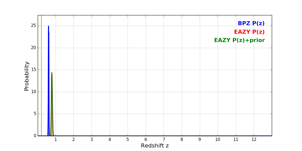In P(z) plots: Yellow lines mark the cluster redshift z = 0.203,