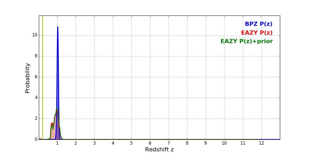 In P(z) plots: Yellow lines mark the cluster redshift z = 0.203,