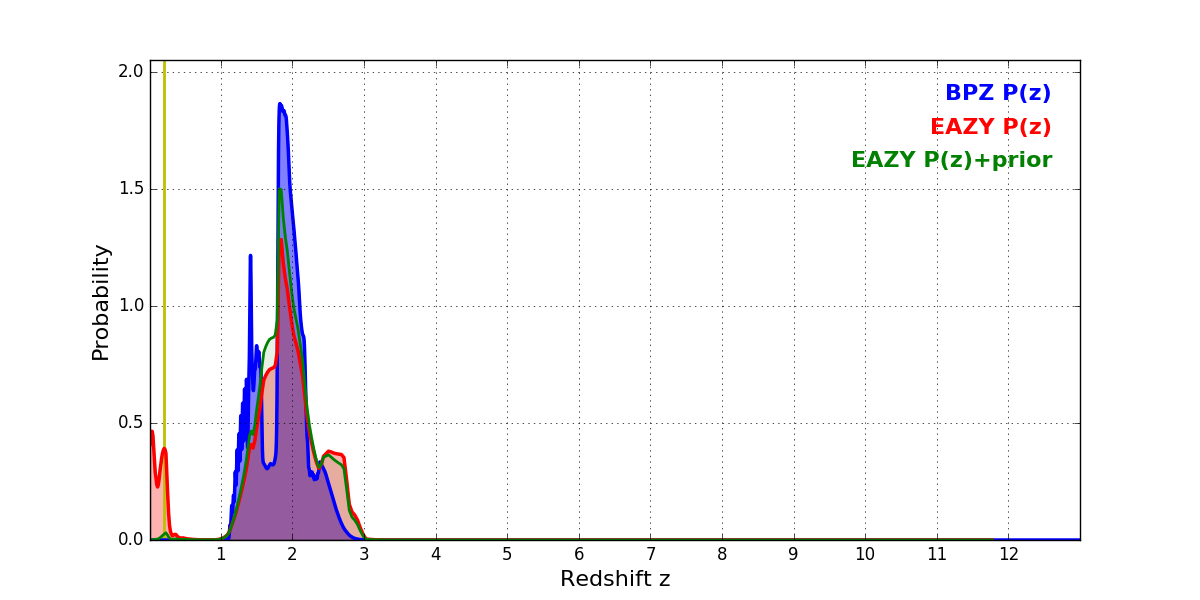 In P(z) plots: Yellow lines mark the cluster redshift z = 0.203,