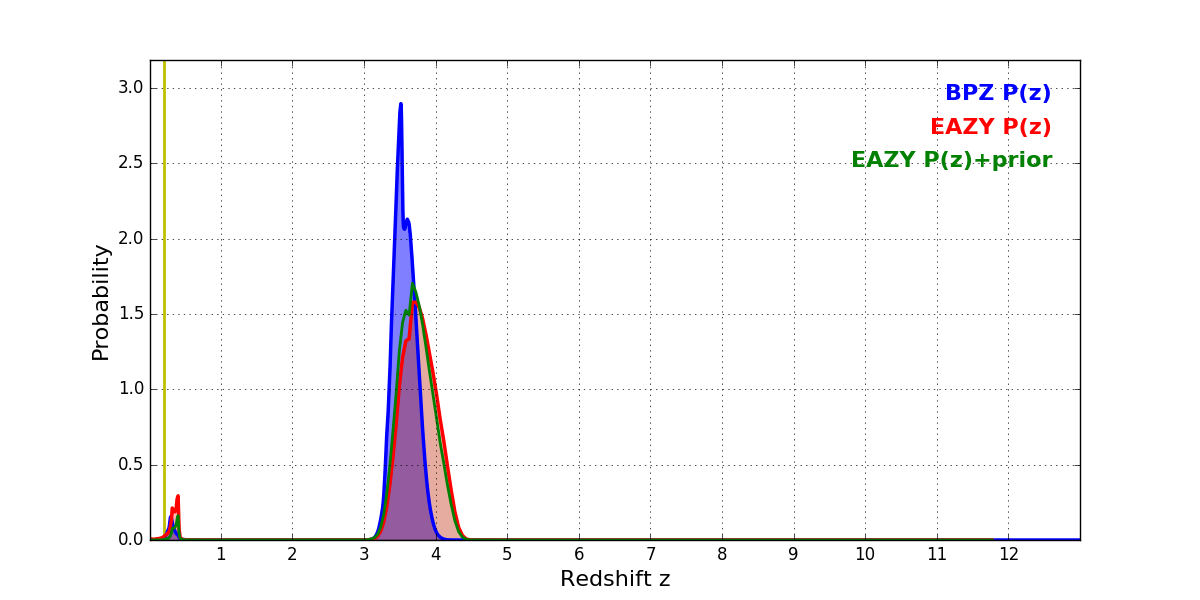In P(z) plots: Yellow lines mark the cluster redshift z = 0.203,