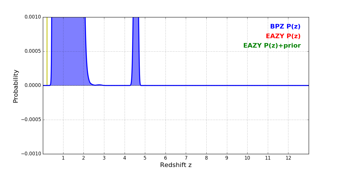 In P(z) plots: Yellow lines mark the cluster redshift z = 0.203,