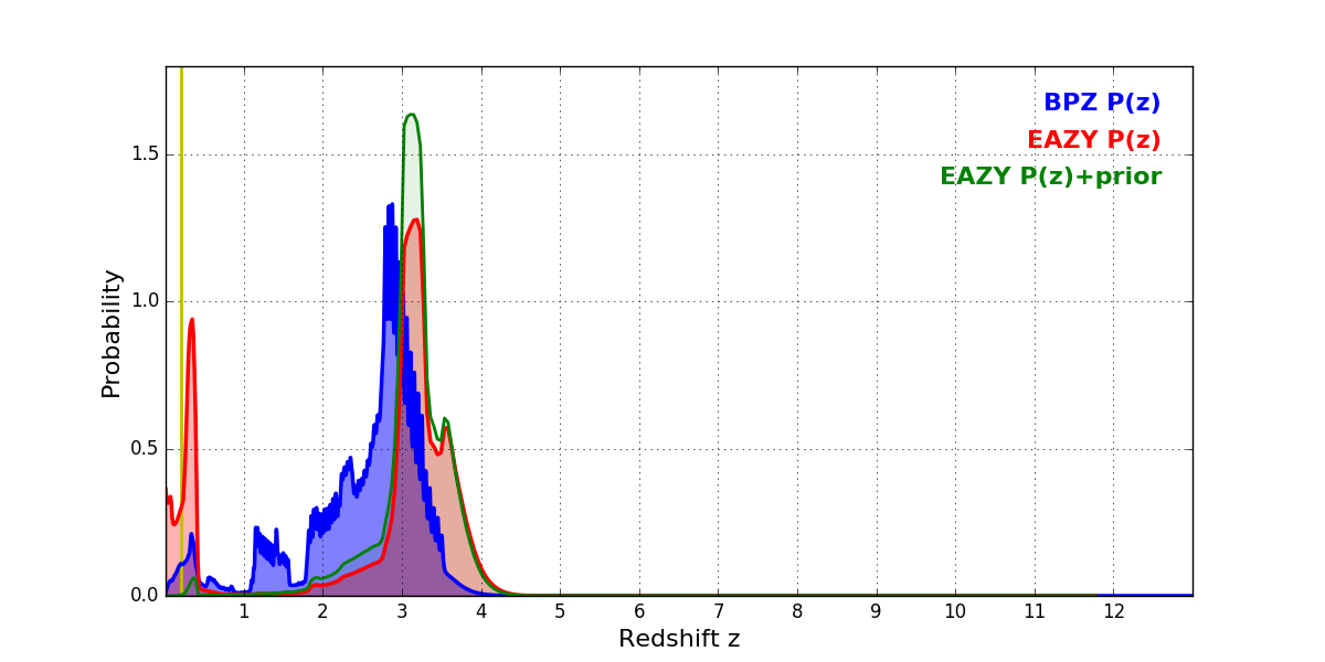 In P(z) plots: Yellow lines mark the cluster redshift z = 0.203,