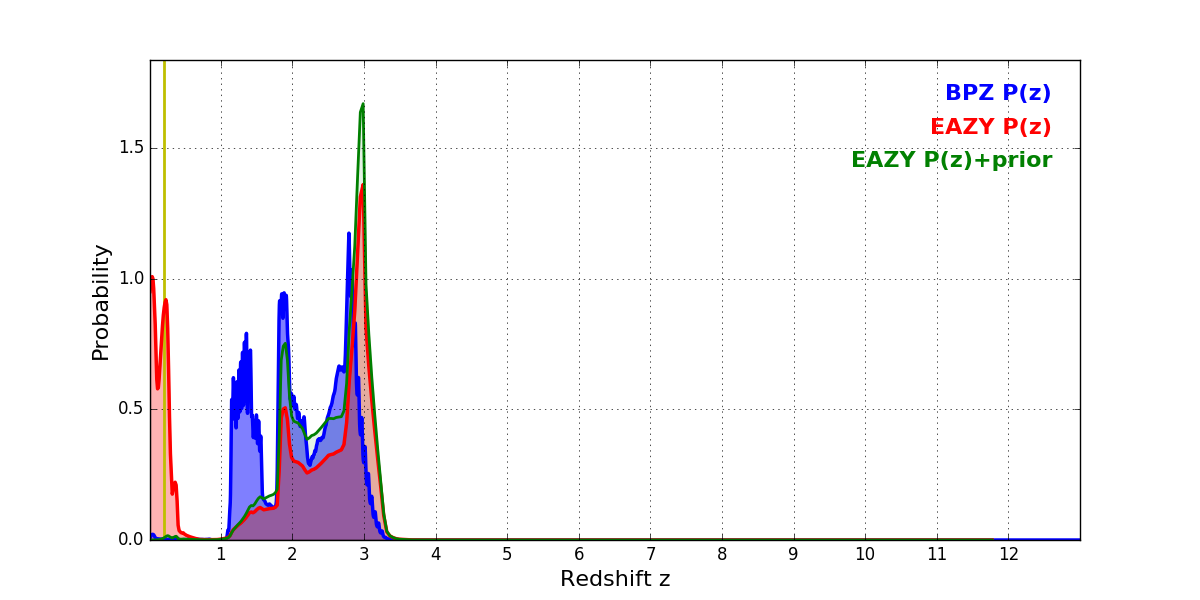 In P(z) plots: Yellow lines mark the cluster redshift z = 0.203,