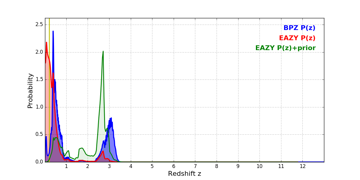 In P(z) plots: Yellow lines mark the cluster redshift z = 0.203,