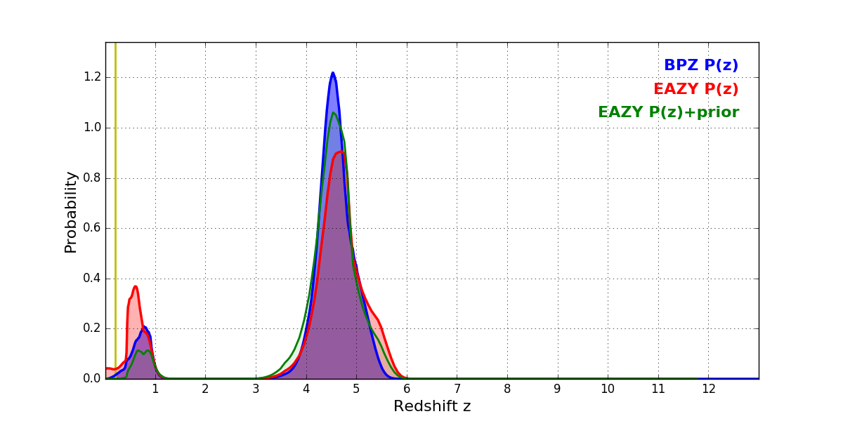 In P(z) plots: Yellow lines mark the cluster redshift z = 0.203,
