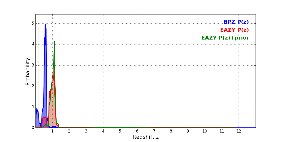 In P(z) plots: Yellow lines mark the cluster redshift z = 0.203,
