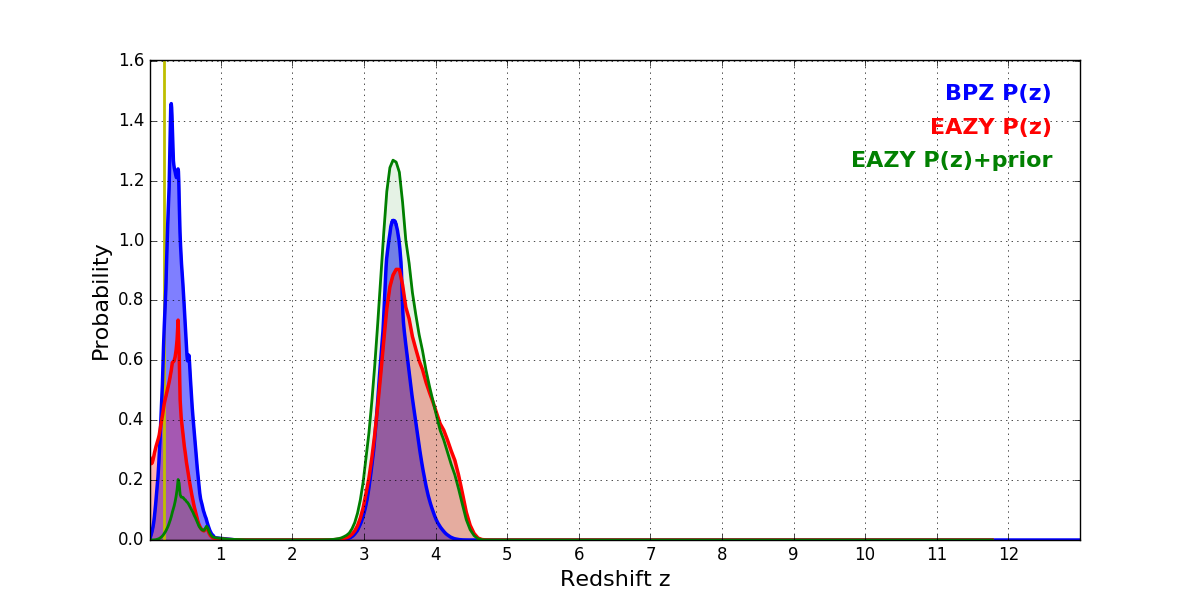 In P(z) plots: Yellow lines mark the cluster redshift z = 0.203,