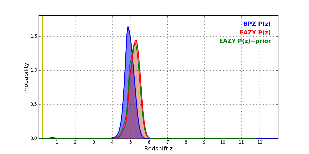 In P(z) plots: Yellow lines mark the cluster redshift z = 0.203,