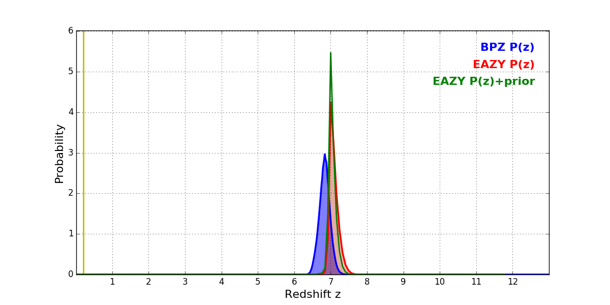 In P(z) plots: Yellow lines mark the cluster redshift z = 0.203,