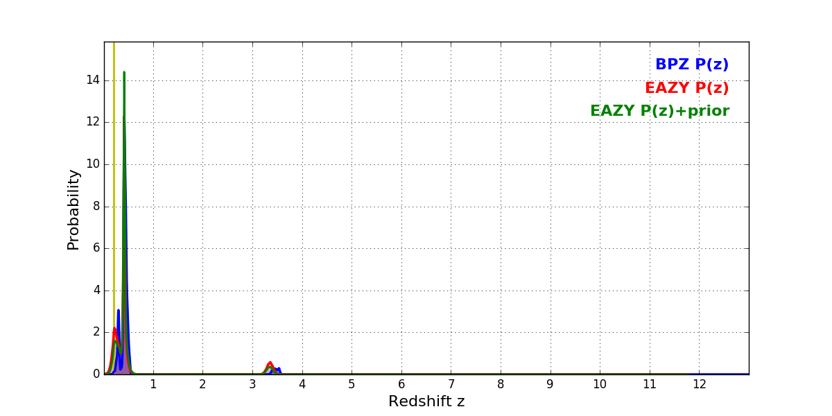 In P(z) plots: Yellow lines mark the cluster redshift z = 0.203,