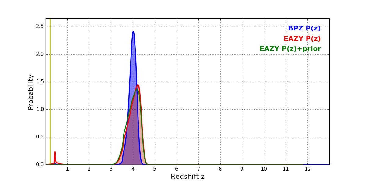 In P(z) plots: Yellow lines mark the cluster redshift z = 0.203,