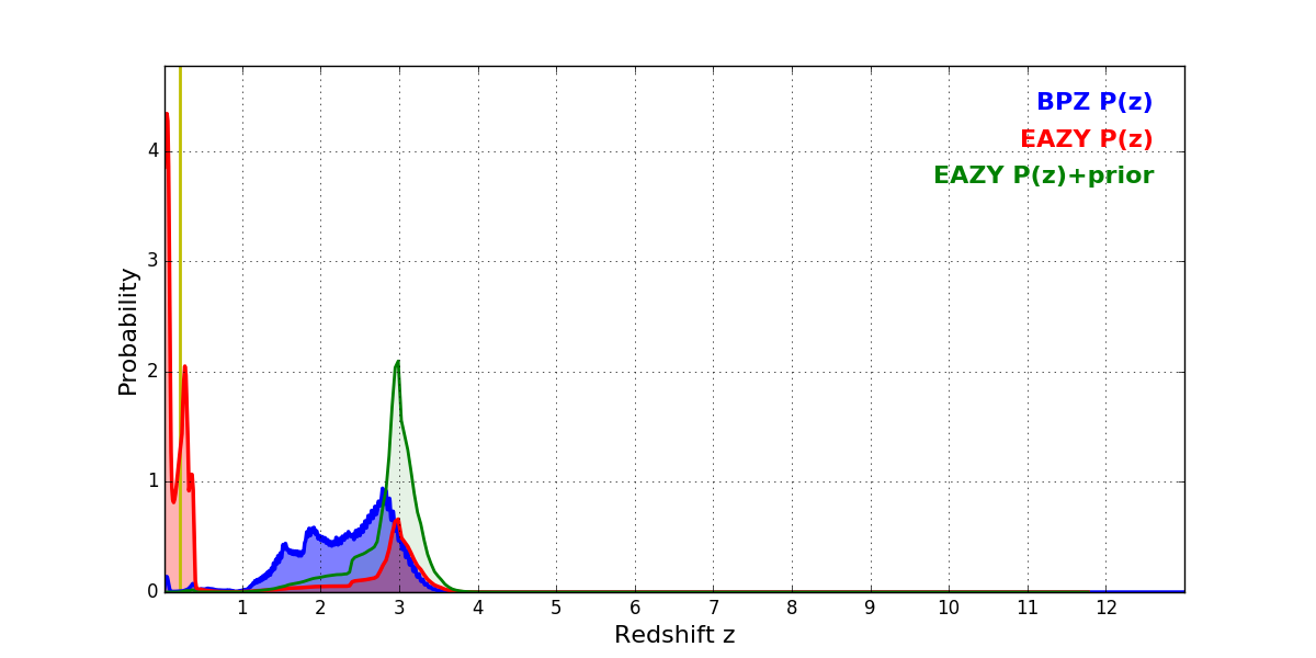 In P(z) plots: Yellow lines mark the cluster redshift z = 0.203,