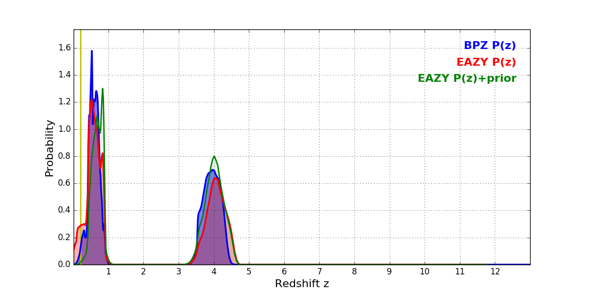 In P(z) plots: Yellow lines mark the cluster redshift z = 0.203,