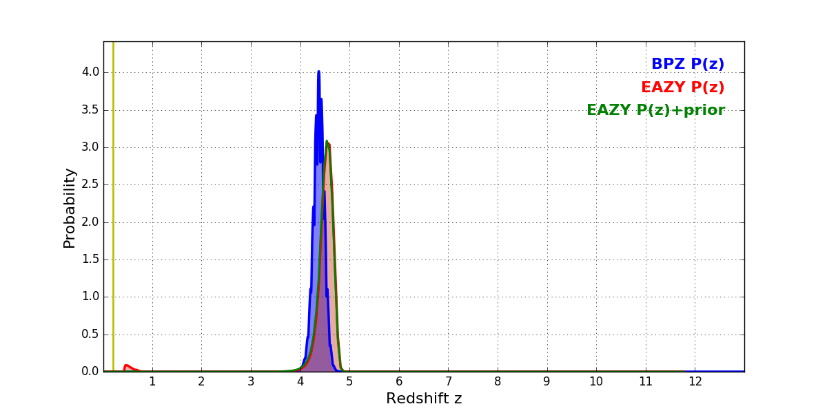 In P(z) plots: Yellow lines mark the cluster redshift z = 0.203,