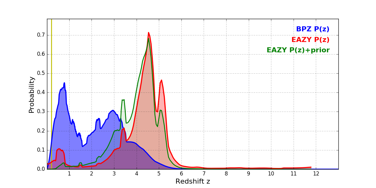 In P(z) plots: Yellow lines mark the cluster redshift z = 0.203,