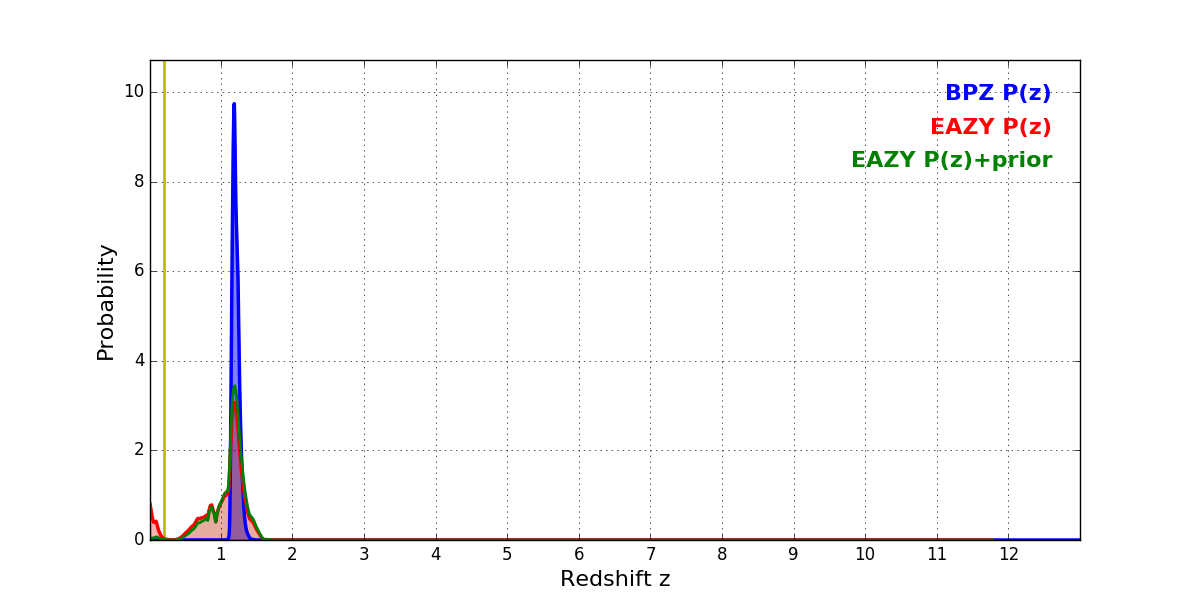 In P(z) plots: Yellow lines mark the cluster redshift z = 0.203,