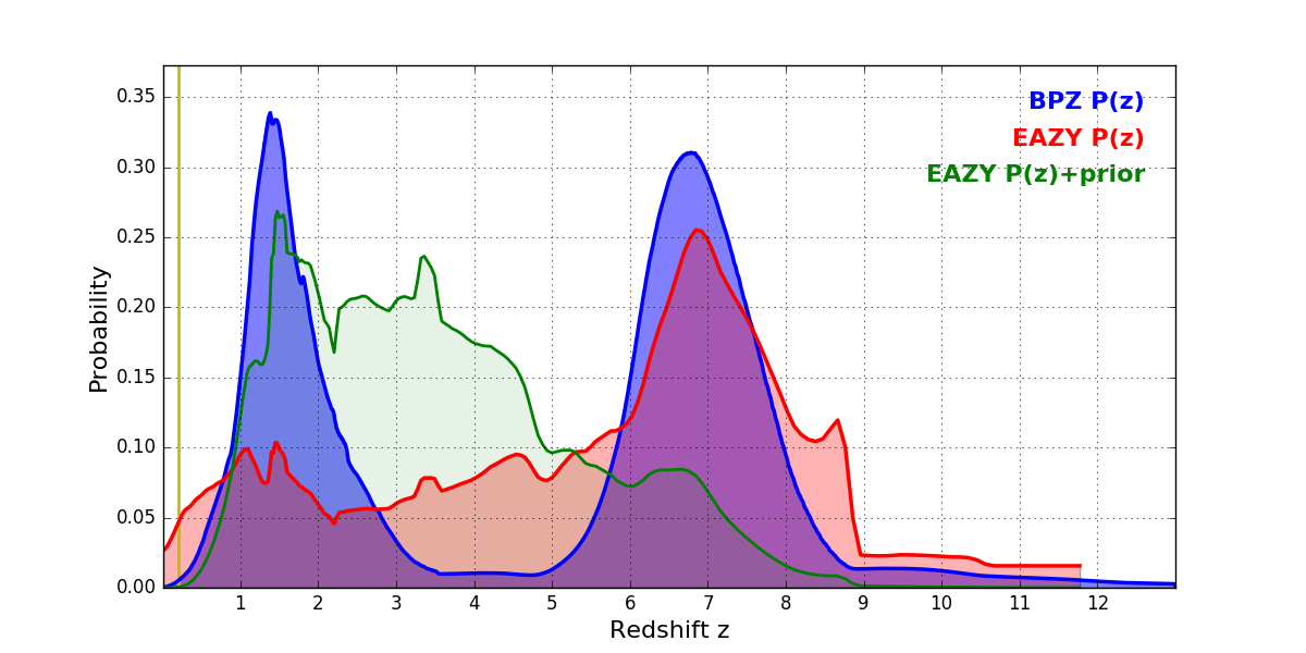 In P(z) plots: Yellow lines mark the cluster redshift z = 0.203,