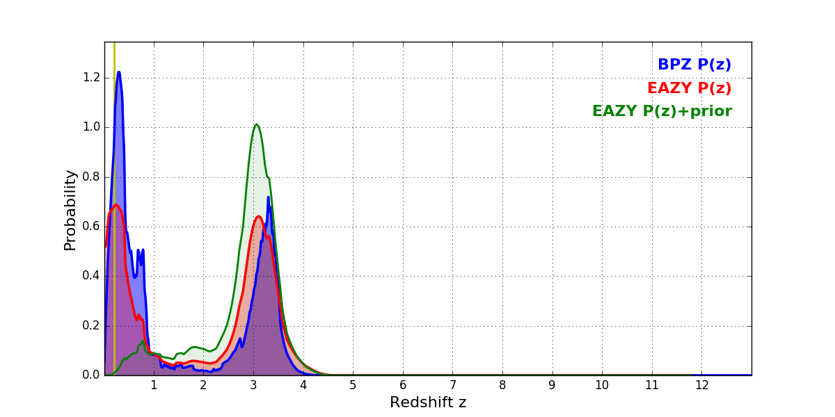 In P(z) plots: Yellow lines mark the cluster redshift z = 0.203,