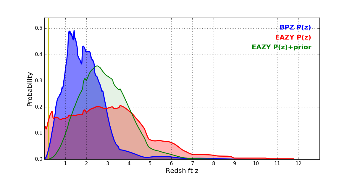 In P(z) plots: Yellow lines mark the cluster redshift z = 0.203,