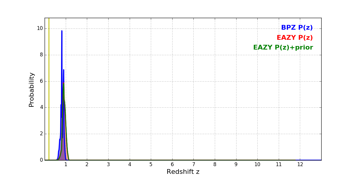 In P(z) plots: Yellow lines mark the cluster redshift z = 0.203,