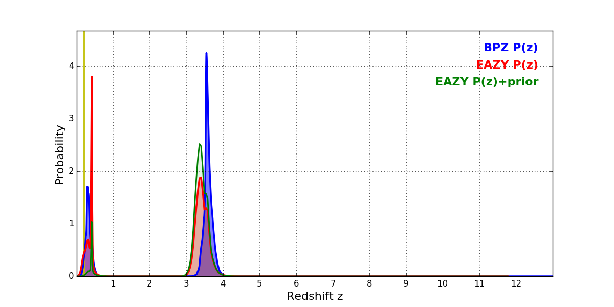 In P(z) plots: Yellow lines mark the cluster redshift z = 0.203,