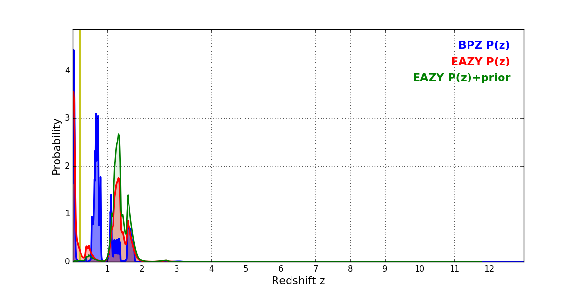 In P(z) plots: Yellow lines mark the cluster redshift z = 0.203,