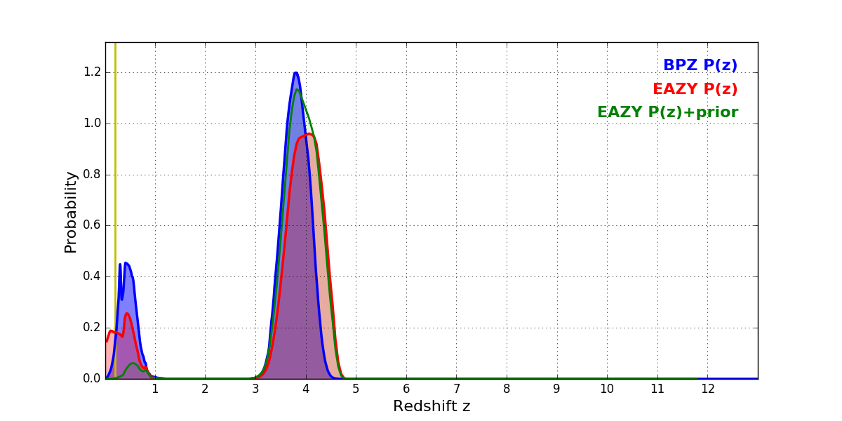In P(z) plots: Yellow lines mark the cluster redshift z = 0.203,