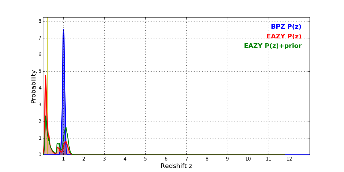In P(z) plots: Yellow lines mark the cluster redshift z = 0.203,
