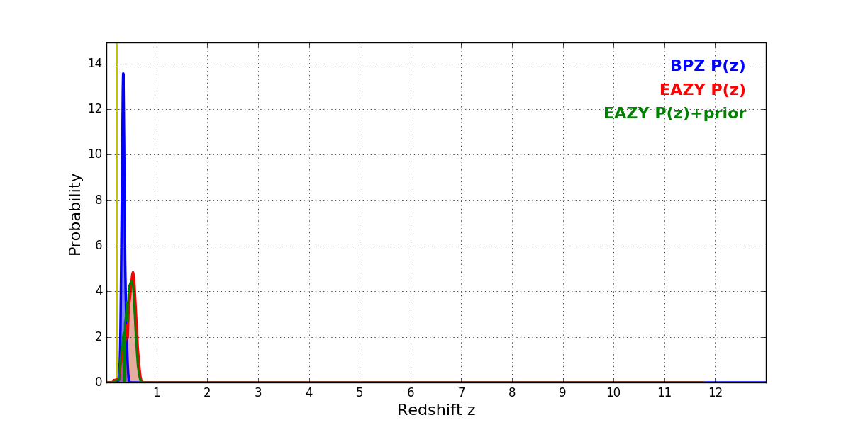 In P(z) plots: Yellow lines mark the cluster redshift z = 0.203,
