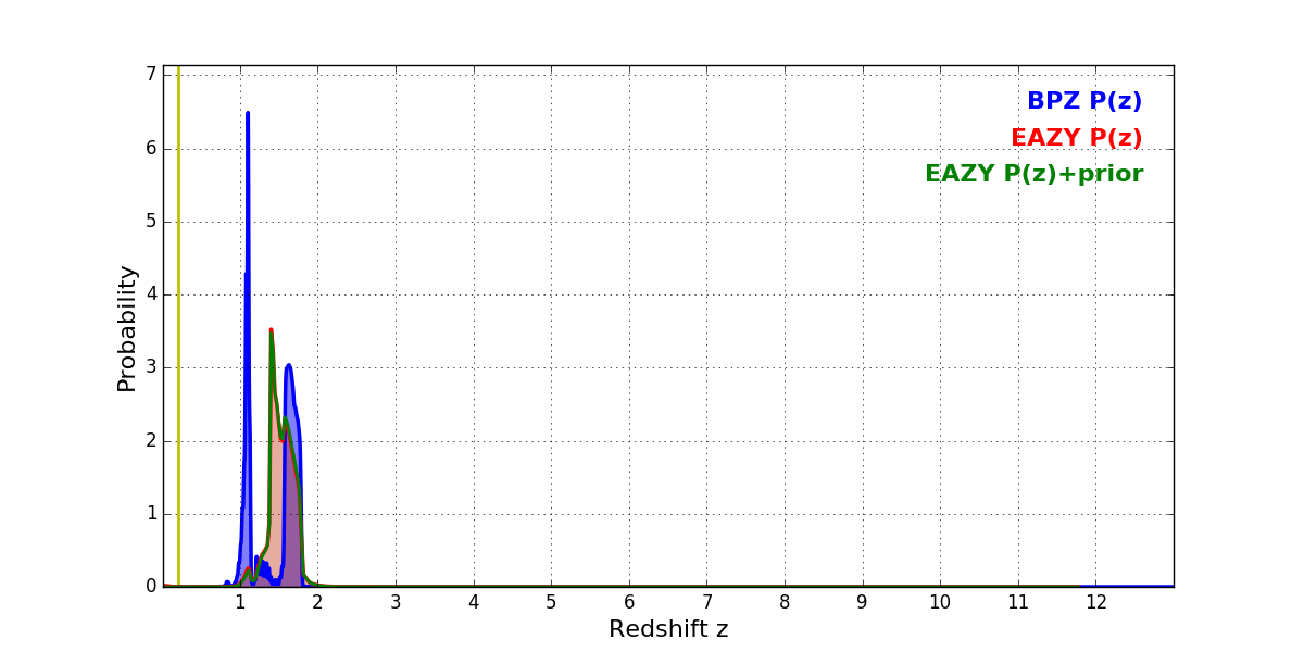 In P(z) plots: Yellow lines mark the cluster redshift z = 0.203,